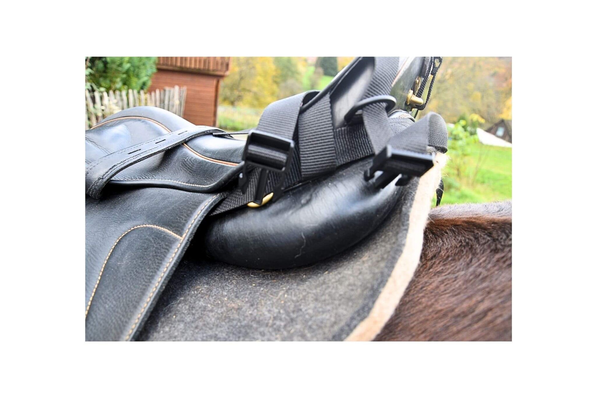 Leg den Adapter auf die Sitzfläche und führ das Gurtband unter dem Sattelblatt durch. Befestige es mit dem Karabiner vorne am Ring, stell nun am Gurtband mit Klett die richtige Länge ein, andere Seite genauso handhaben.
