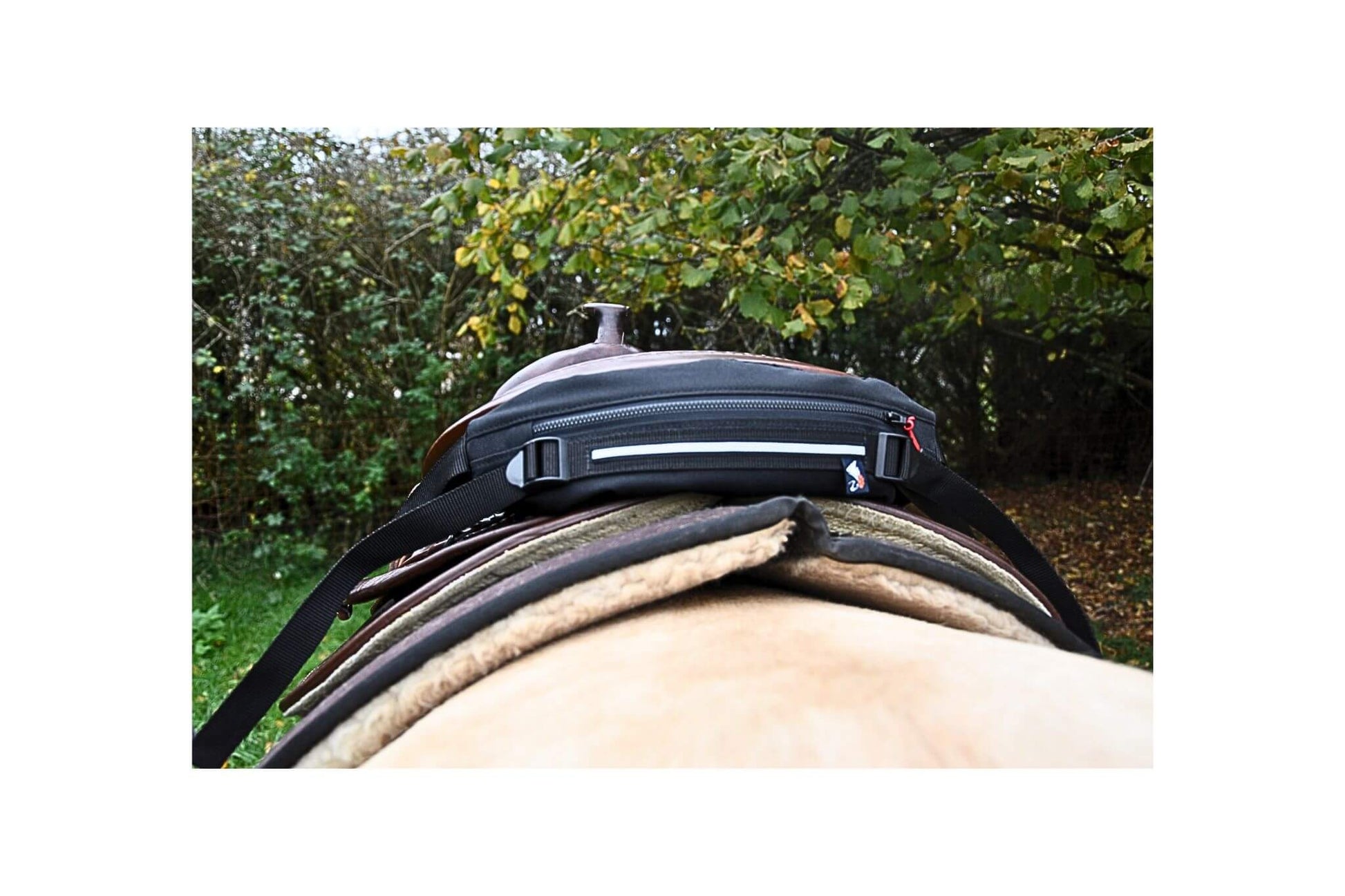 Regenschutz“ Wolkenbruch“ Westernsattel ist in einer kleinen Tasche integriert, so dass er leicht am Sattel mit 2 Karabiner angebracht und mit dem Gurtband, je nach Größe, eingestellt werden kann.